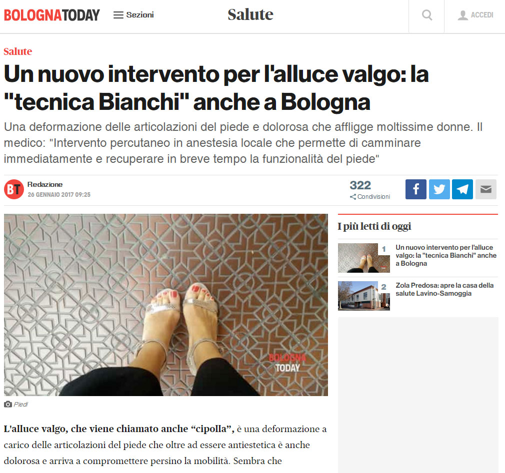 Bologna Today ha scritto un articolo sulla tecnica PBS di trattamento dell’alluce valgo. I chirurghi PBS operano con il servizio sanitario nazionale a Bologna e in molte altre cliniche convenzionate su tutto il territorio nazionale.