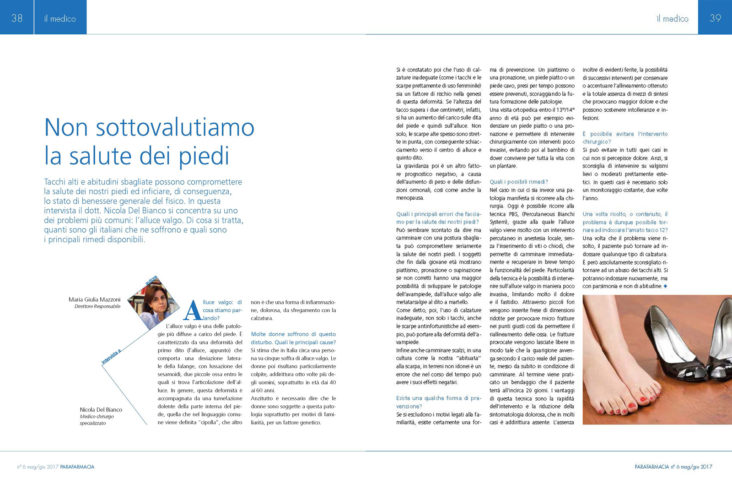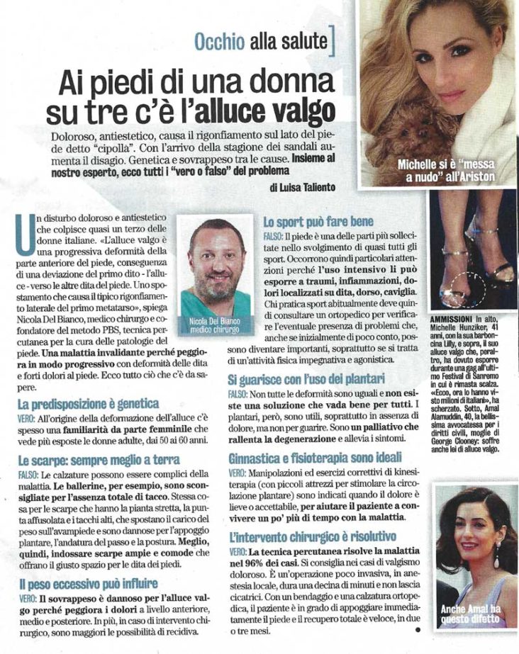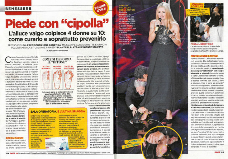 Si parla di tecnica PBS e di chirurgia tradizionale nell’articolo uscito in questi giorni sul settimanale Oggi. Il dott. Andrea Bianchi e il podologo Damiano Guerra rispondono alle domande della giornalista sulle cause dell’alluce valgo e sui trattamenti per rallentare il progredire della deformità.