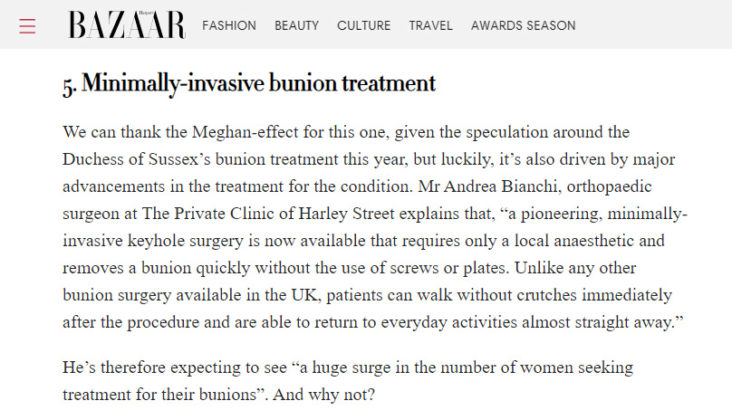 Harper’s Bazaar UK inserisce tra i trends del 2019 l’intervento percutaneo per la cura dell’alluce valgo con tecnica PBS.