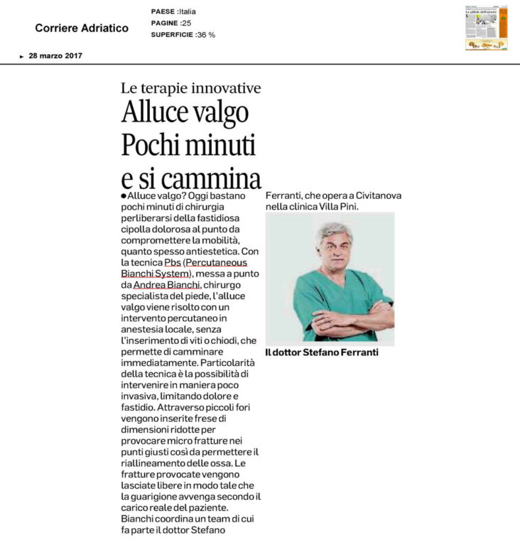 Il Corriere Adriatico ha dedicato un articolo alla tecnica PBS di cura dell’alluce valgo “Alluce valgo. Pochi minuti e si cammina”