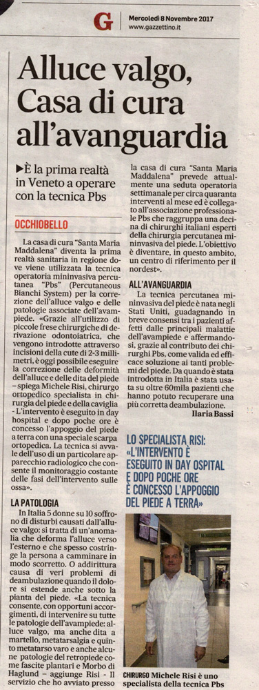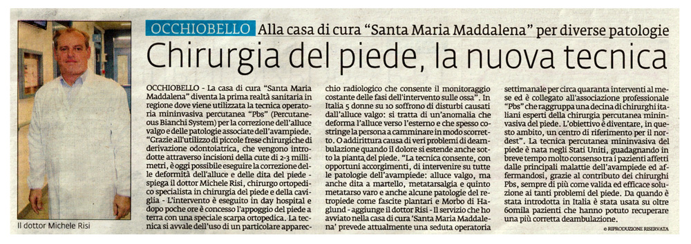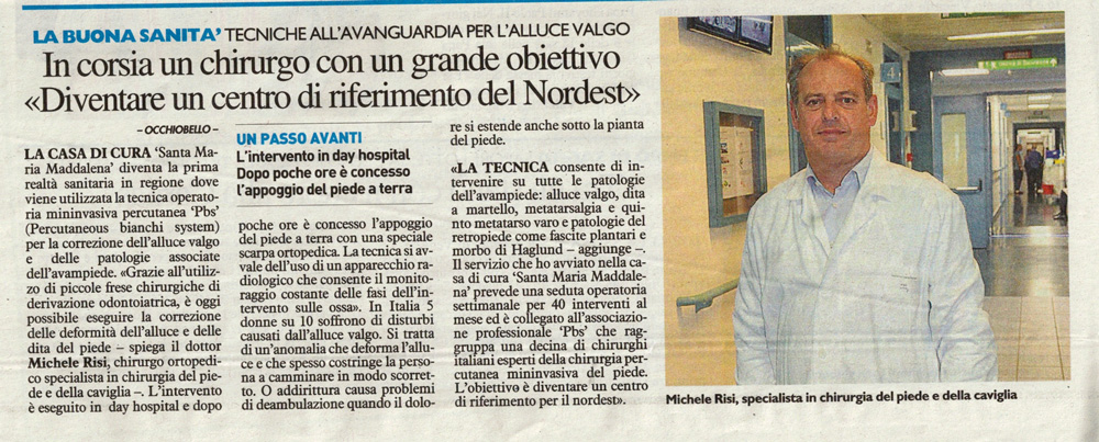 Da settembre PBS è anche ad Occhiobello in provincia di Rovigo presso la casa di cura S. Maria Maddalena. Il Dott. Michele Risi, chirurgo del Team PBS, opera l’alluce valgo e i difetti dell’avampiede con la tecnica PBS in Veneto come racconta negli articoli che riportano la notizia.